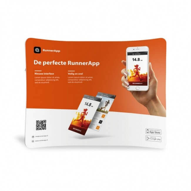 Gebogen beurswand display met geprinte hoes van textiel, afgewerkt met een rits. Inclusief tas.